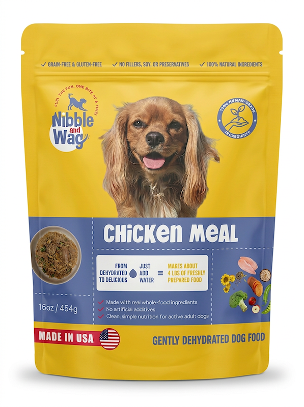 Nibble Chicken Meal: A gently dehydrated, complete and balanced meal for adult dogs. Made with real, whole-food ingredients and no artificial additives - just clean, simple nutrition for active adult dogs.